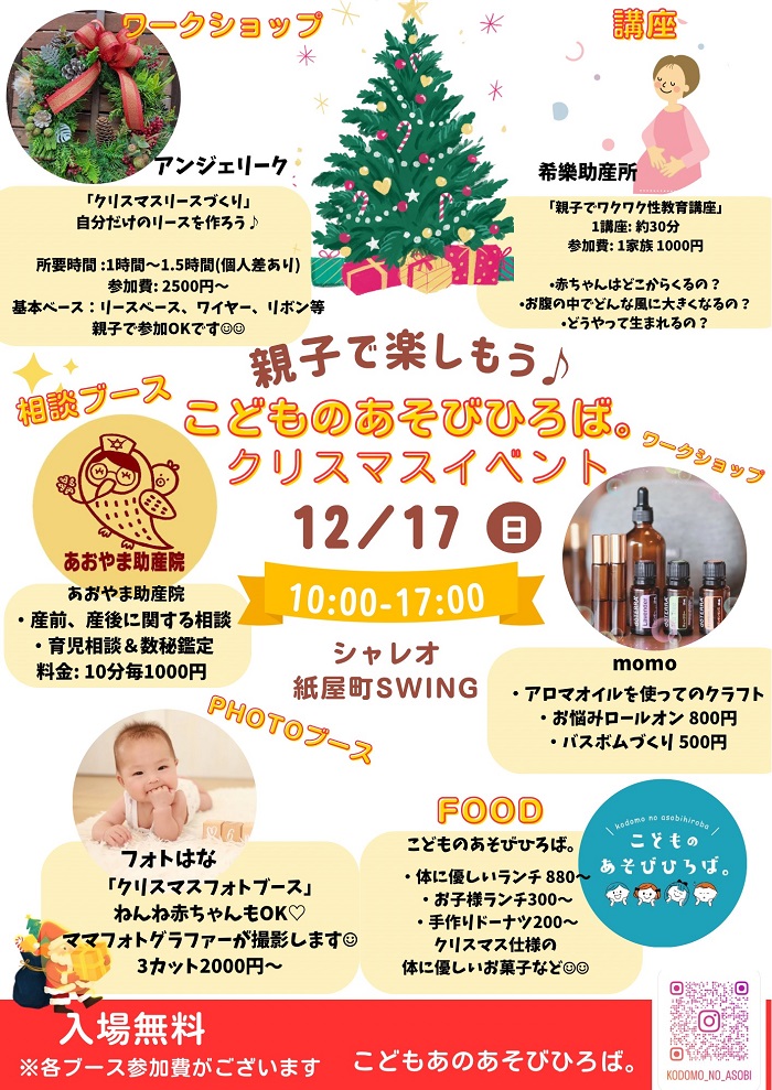クリスマスフォトブース、子供向けクリスマスグッズ制作、助産師さんの相談ブース、お菓子・飲食販売を行います。詳しくはこちら