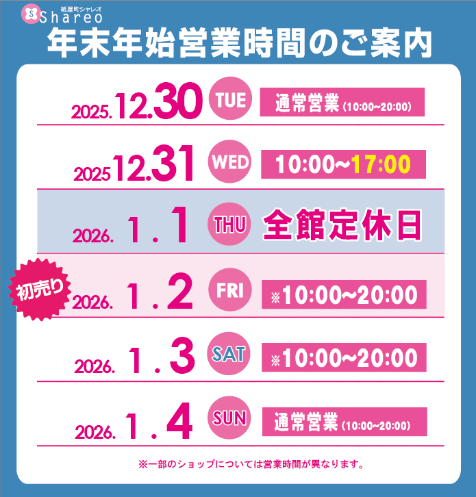 ウォンツ 地下街シャレオ薬局 12.31(水)~1.4(日)