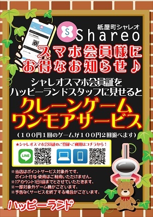 シャレオスマホ会員証をハッピーランドスタッフに見せると、100円1回のクレーンゲームが2回遊べます!!