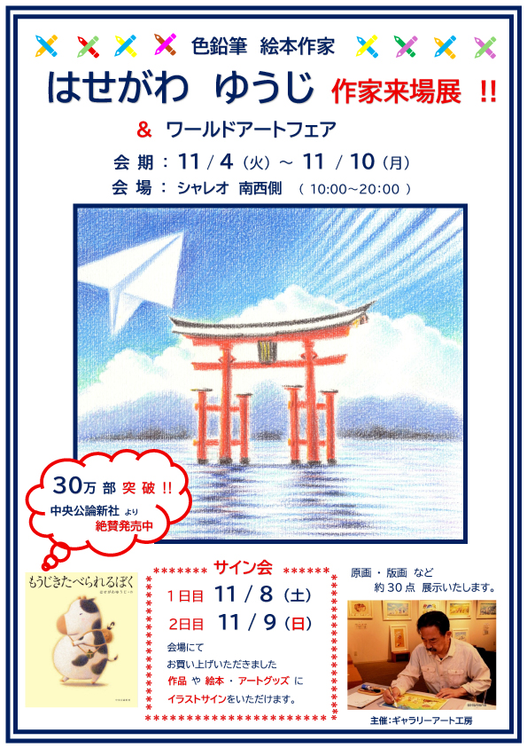 メルヘン作家の原画・版画・グッズ等の展示販売と、絵本作家はせがわゆうじ来場展を開催します。